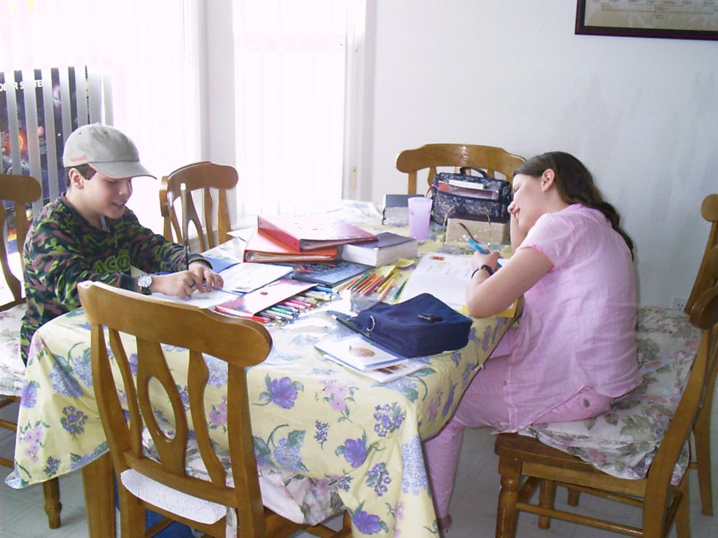 Johny and Laila are doing schoolwork at the kitchen table.