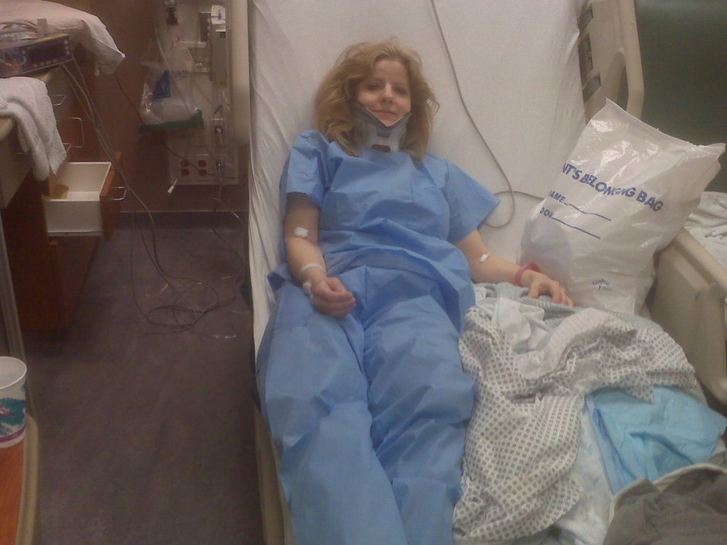When I got to the hospital, they cut off all my clothes. They did a CT scan. I had whiplash, and my right shoulder was in a lot of pain.