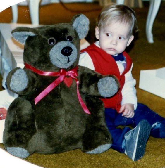 Jared sitting with a bear that I had made. I had not been able to sell it, so I gave it to Jared for Christmas. When you pressed the bear’s heart, it played “You are my sunshine.”